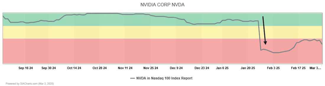 Having technically analyzed Broadcom Inc. in yesterday’s Daily Stock Report, we thought we would take a moment to review the charts of another widely held stock today that needs no introduction. NVDA was the big winner in 2024 but has been sputtering out of the gate for 2025, as both the shares have turned decidedly negative on its SIA relative strength rank, along with the sector, which has also slipped negative on its relative strength rankings within the SIA Market Sector report. This slippage of relative strength is easily seen on the SIA matrix position chart attached, which shows NVDA shares moving through the yellow neutral zone of the report into the red unfavored zone, putting SIA practitioners on alert.