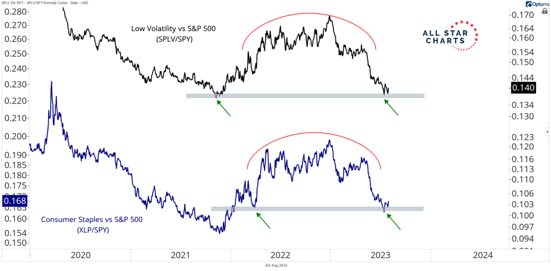 As can be seen, the relative trends of Low Volatility (SPLV) vs. the S&P 500 (SPY) and Consumer Staples (XLP) vs. the S&P 500 (SPY) are testing key former lows: