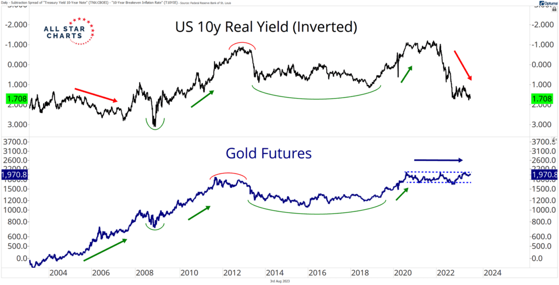 Notice the divergence between the 10-year real yield and gold at the beginning of the century (and the early innings of the previous commodity supercycle).