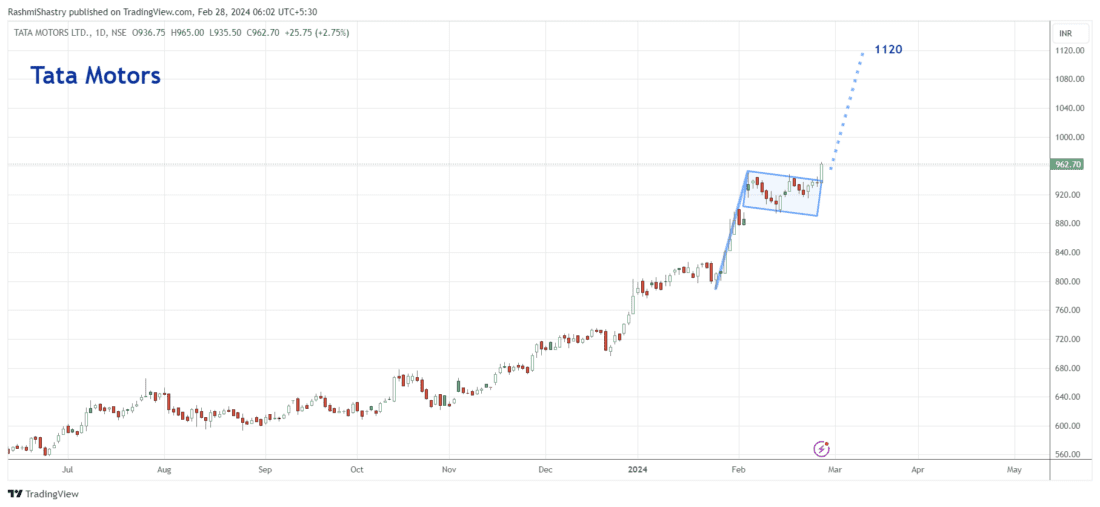As Nifty auto continues to display absolute and relative strength, Tata Motors is ready to move higher towards 1120. I once heard an analyst refer to new price territory as purple skies, and that stuck with me. So here we have Tata Motors in purple sky territory!