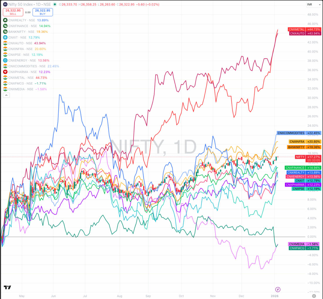 While Bank Nifty (19%) and Infrastructure (20%) have outperformed the benchmark, their growth has been more measured as the market prices in the 125 bps cumulative repo rate cuts seen throughout 2025.