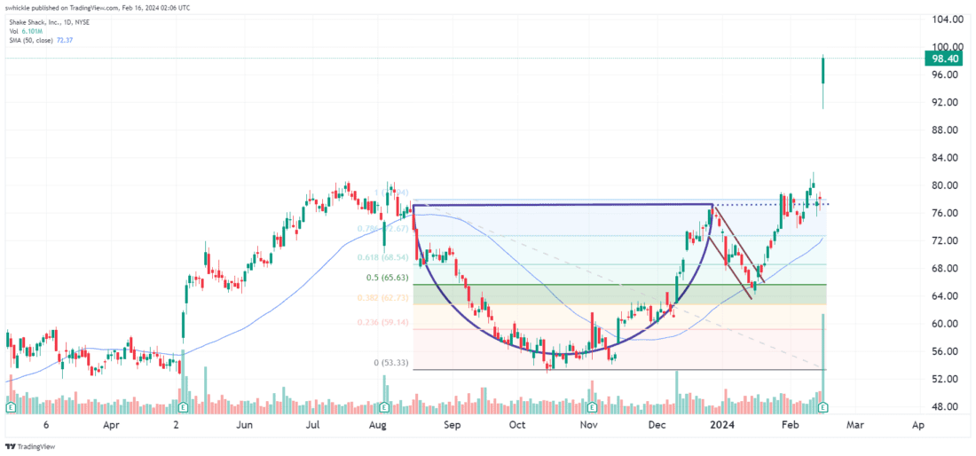 Shake Shack’s (SHAK) has crafted a deliciously enticing cup and handle pattern. Yesterday the burger chain was up 26% after reporting higher than expected results for both the top and bottom line. These results combined with a bullish cup and handle continuation pattern resulted in a remarkable move higher.