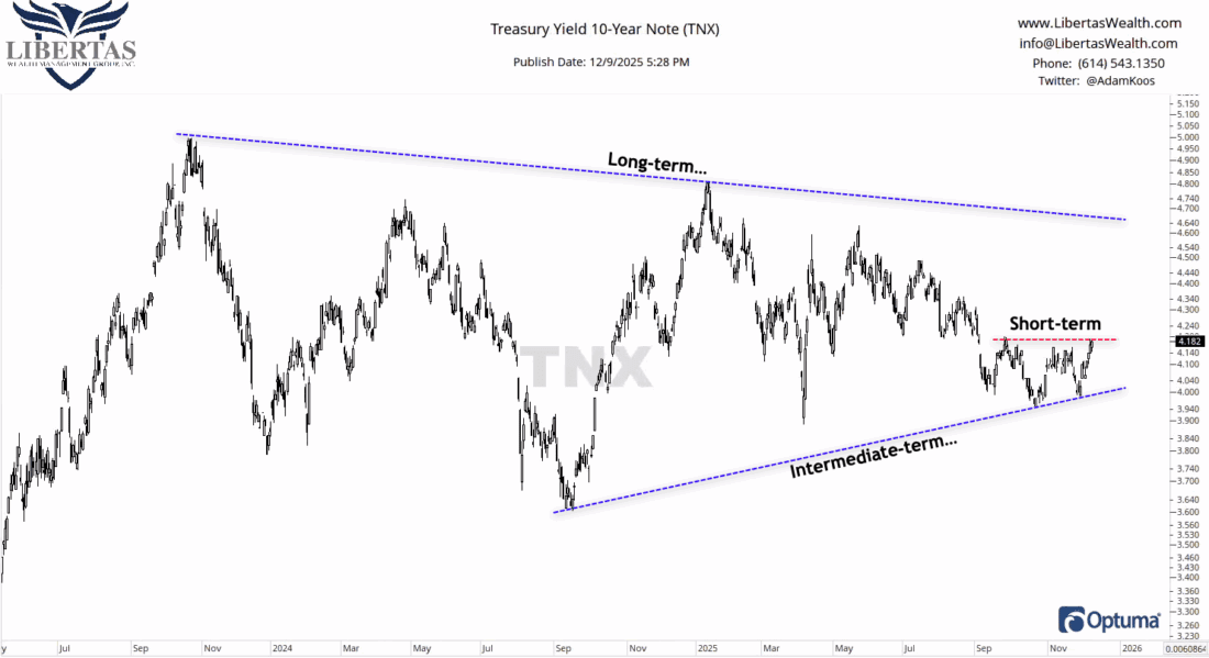 You can see in the chart below how the 10-year Treasury Yield peaked in fall of 2023, and while you could call it “trendless” at the moment (with some short-term choppiness and even a potential short-term breakout), the long-term trend is leaning negative, which is where it should continue if the Fed continues cutting rates into 2026 (which they likely will)