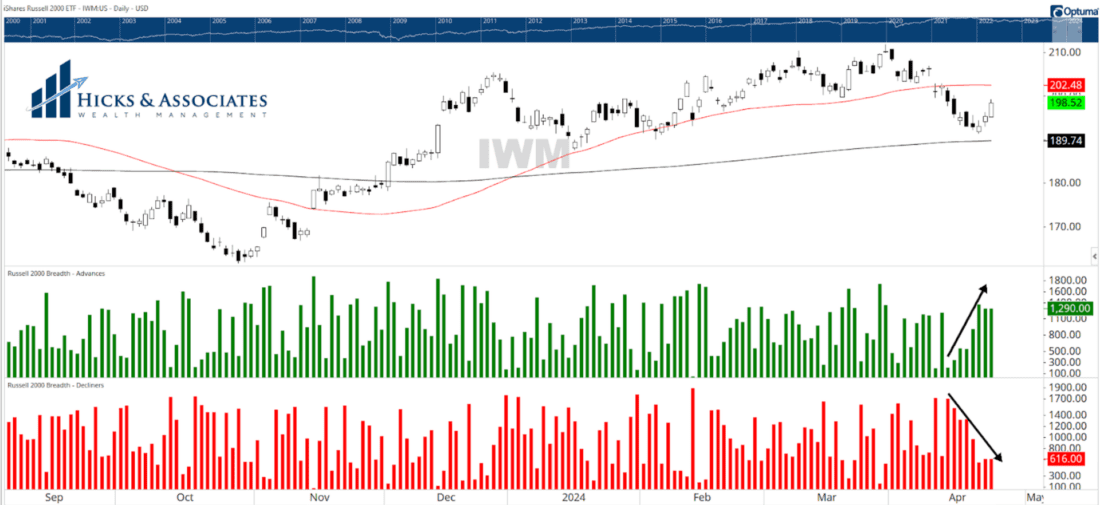 (IWM). Instead of showing the percentage of the Russell 2000 that is trading above the 200-day moving average (Chart 1), Chart 2 is showing the number of stocks within the Russell 2000 that are advancing (green bars) each day versus declining (red bars) each day.