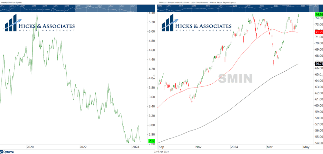 On the left, I am showing a division spread chart. This chart simply takes one ETF and divides it by the other ETF. The resulting line chart then points to the stronger of the two positions. For this division spread chart, I have the US iShares Russell 2000 divided by the iShares India Small-Cap ETF (SMIN). The line’s slope is down thereby pointing to the denominator. Therefore, if you want Small-Cap exposure, you might want to look at the India Small-Cap sector.