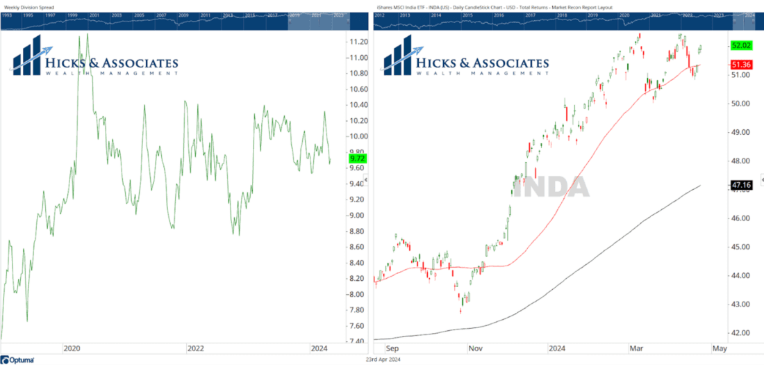 If we were to do this same analysis of the S&P 500 relative to the iShares India ETF (INDA), we will see that these two country ETFs are more finely balanced as evidenced by the sideways trend to the division spread chart.
