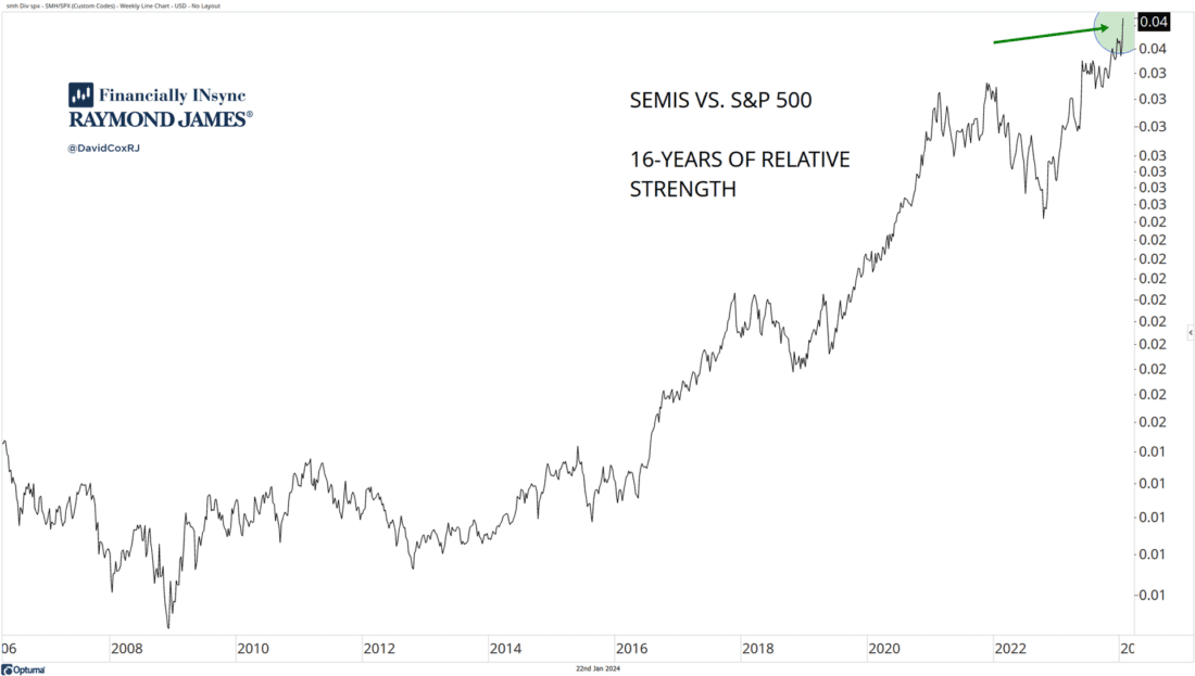 Many investors spend an inordinate amount of time trying to figure out what stock is going to rise, or what stock deserves to fall. By using relative strength, we can seek to understand what stocks, or groups of stocks, are rising (or falling) more strongly than the market itself. Because if we as investors, want to beat (outperform) the stock market, we have own stocks that are rising more strongly. The semiconductor stocks are shown here, vs. the S&P 500. The chart shows that since the 2008 lows, the semiconductor stocks have been in a relative uptrend for the past 16 years (that’s a LONG time!). And so any debate about this group of stocks aside, do know, that a 16-year relative weekly chart won’t change on a dime or with a down day in the market. Know the trend and follow the trend, until the trend ends.