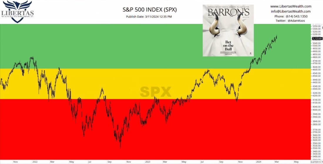 While there is no arguing with this uptrend, it would make complete sense if the market digested some of the recent gains, pulling back to the 2021 highs, or even the spring ’22 and summer ’23 highs (marked by the top of the caution zone / bottom of the green zone).