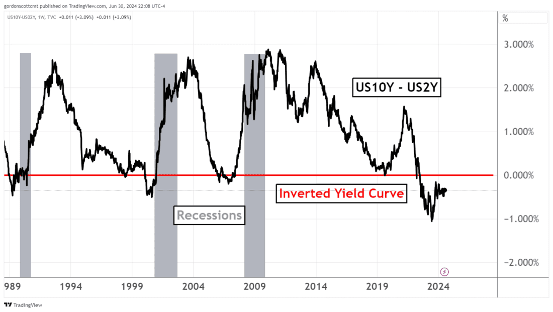 This refers to the idea that short-term borrowing rates are higher than longer-term ones. This is easily tracked by subtracting yield on the 2-year U.S. Treasury Note from the yield on the 10-year note (see chart below).