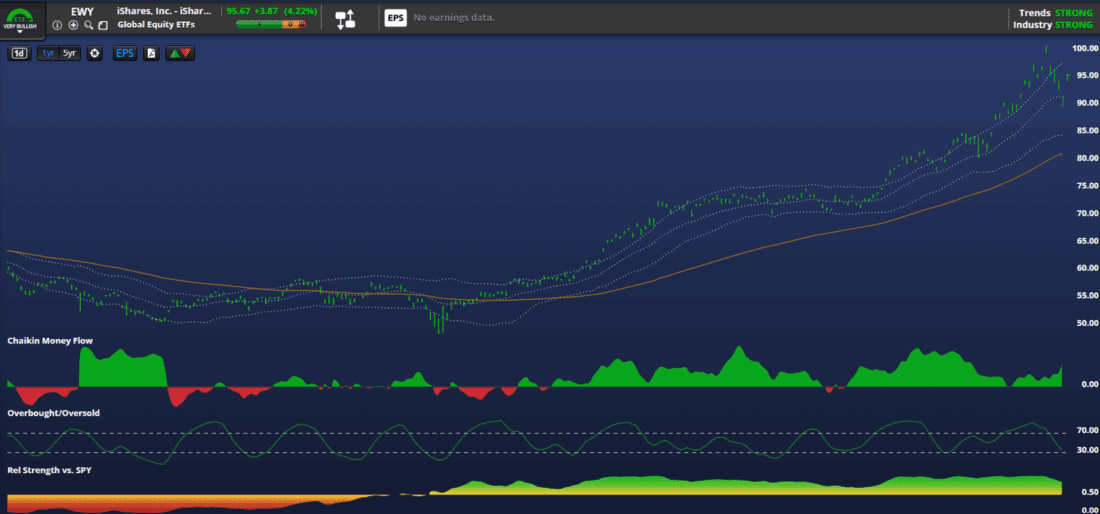 The iShares MSCI South Korea ETF (EWY) has cemented its status as a global technology leader, delivering a remarkable 61% year-over-year gain, including a strong 4.2% advance on Monday. This impressive run is built on a solid technical foundation that began when the ETF hit its 52-week low near $48 on April 8th. Although its 200-day moving average was initially sliding, EWY managed its first decisive close above this major trend line on May 14th, confirming the new long-term uptrend.