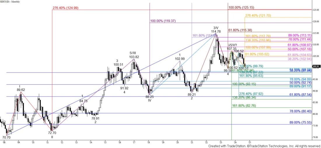 Settling below 99.79 would call for a major support threshold around 98.00 to be challenged. This is a key level because it is the smaller than (0.618) target of the wave down from 114.78 (green), the 38 percent retracement of the rise from 70.70 (blue), and the 62 percent retracement of the rise from $88.25 (light blue). Settling below 98.00 will likely be a challenge given the confluence and importance of this support level. However, a monthly close below 98.00 would reflect bearish sentiment for the dollar for at least another several months. This is because the wave down from 114.78 (green) would favor an eventual test of its 92.15 equal to (1.00) target.
