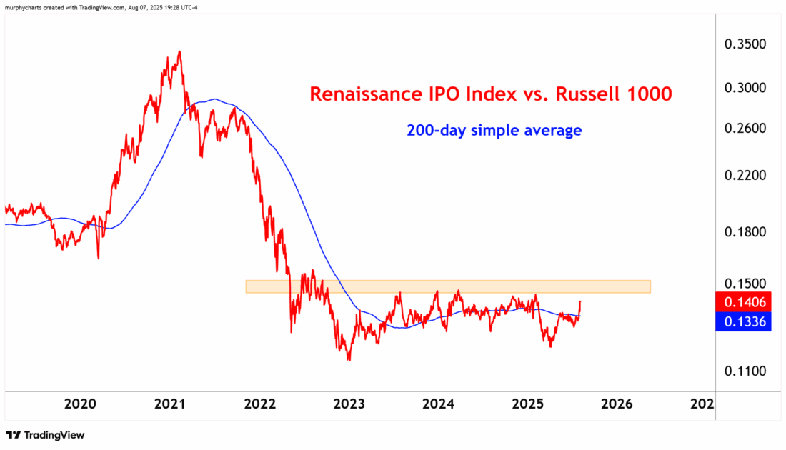 If we are entering a truly speculative phase of the market cycle, one should expect IPOs to outperform. The ratio has failed to form new highs for several years. A breakout would serve as evidence of increased risk appetite among investors.
