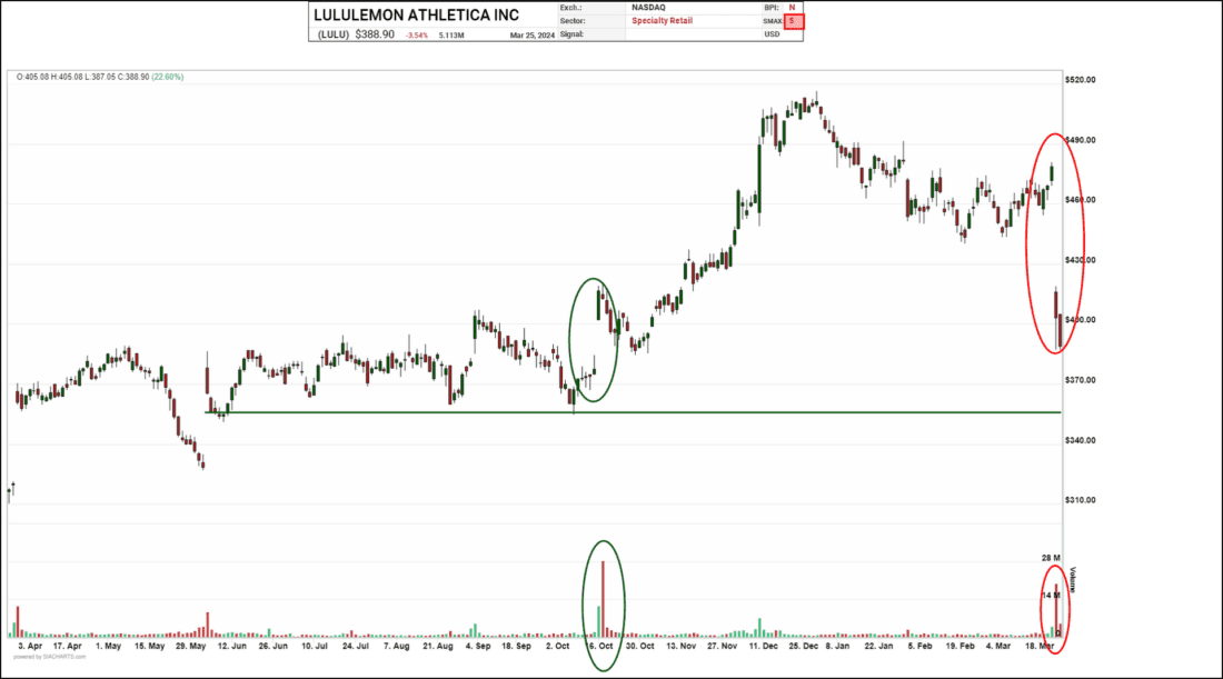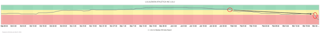 Lululemon athletica (LULU) reported earnings after the close last Thursday and then plunged 15.8% last Friday. Relative strength analysis had provided indications that the stock was vulnerable heading into the earnings report. LULU dropped out of the green zone into the yellow zone of the SIA NASDAQ 100 Index Report on February 2nd. From then to March 20th, the shares were essentially flat, posting a meager 1.4% gain, while the NASDAQ Composite rose 4.9% over the same period.