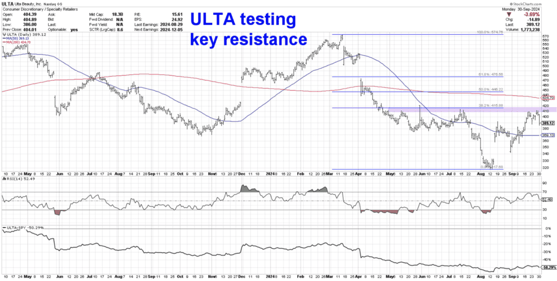 After reaching down to around $320 in early August, ULTA gapped higher to the 50-day moving average, eventually retesting key resistance around the $410 level.