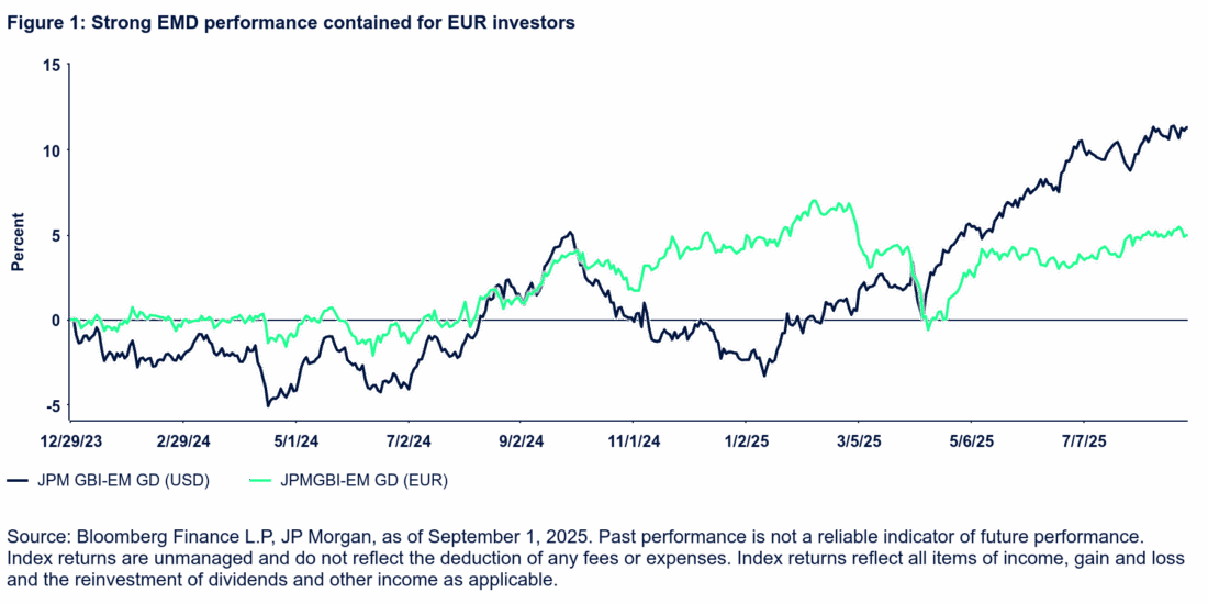 Our outlook from earlier this year projected strong performance prospects for both local and hard currency EM debt. At the time, we held a slight preference for hard currency bonds, but as 2025 unfolded, local currency debt has proved to be the stronger segment (as of August 31). Local currency debt (as measured by the JPM-GBI EM Index) returned 13.8% in USD terms, with contributions of 6.2% from currency appreciation and 7.2% from bond performance. The performance has been broad-based across EM regions and countries, and across both bond and currency returns. Clearly, EM FX has been an important factor in returns in 2025, although this has been largely due to the weaker USD. Indeed, in unhedged EUR terms, the local currency index has returned a very modest 0.7% — resulting from the 12% relative gain by the euro versus the US dollar this year. The turnaround since the start of 2024 is notable (Figure 1).