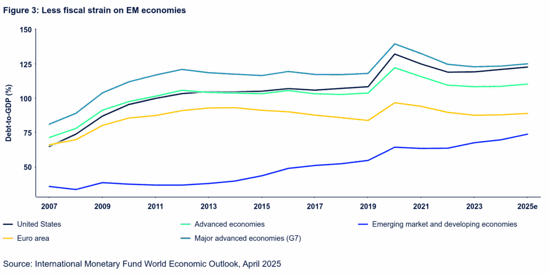 Within the emerging markets universe, we anticipate looser monetary conditions to evolve as the impact of tariffs dampen inflationary pressures via weaker output growth and forced consolidation. The weaker US dollar further bolsters this assessment as this currency dynamic has historically been supportive of strong returns in EMD — and has been evident in performance this year. While some low-income countries in the EM universe are grappling with debt service burdens and the overall EM debt-to-GDP ratio has risen, the comparison with developed markets continues to be favorable (Figure 3).