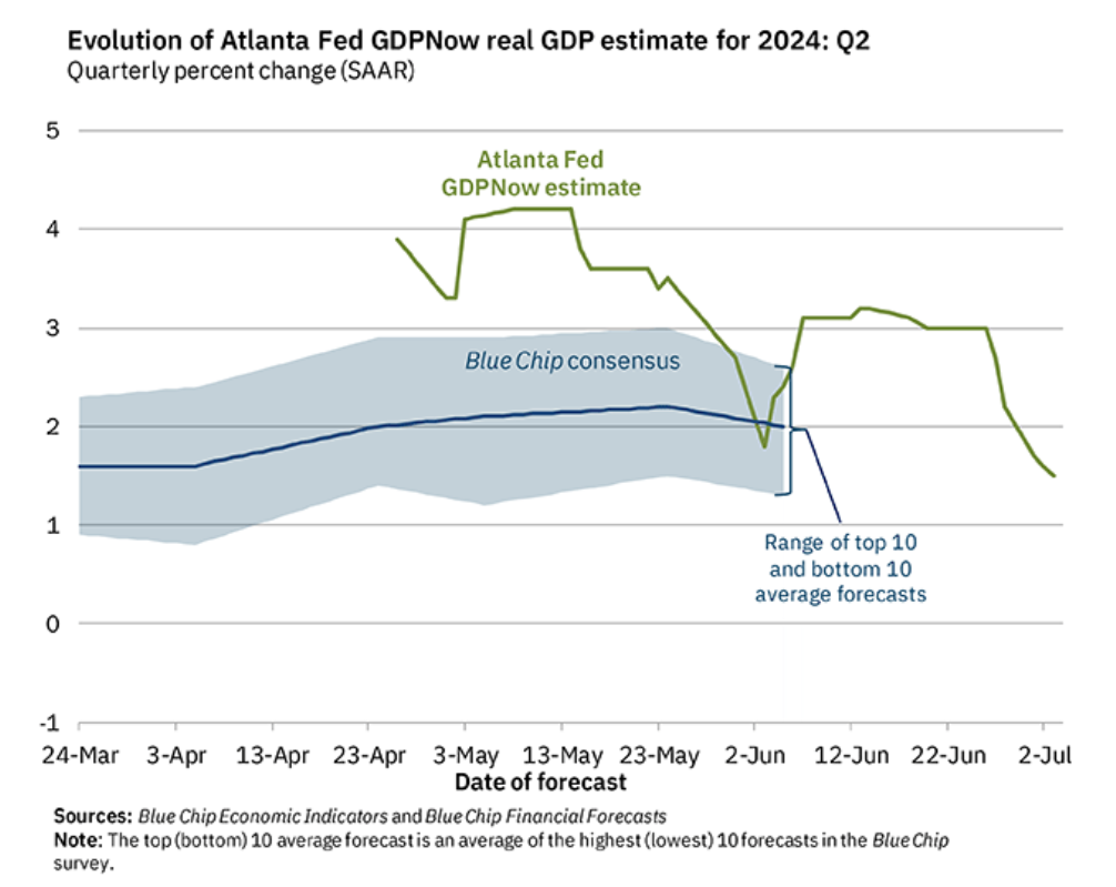 The rising likelihood of a September cut is why I believe that July’s meeting is increasingly consequential.  There is growing evidence that the pace of economic growth is slowing.  Just as disinflation tells us that prices are rising, just more slowly, we saw a similar effect today in the jobs market.  We also see this reflected in GDP estimates.  As of Wednesday’s update, the Atlanta Fed’s GDPNow estimate is for a second quarter increase of 1.5%.  Indeed, that reflects a growing economy, but at a slower pace, as the graph below shows: