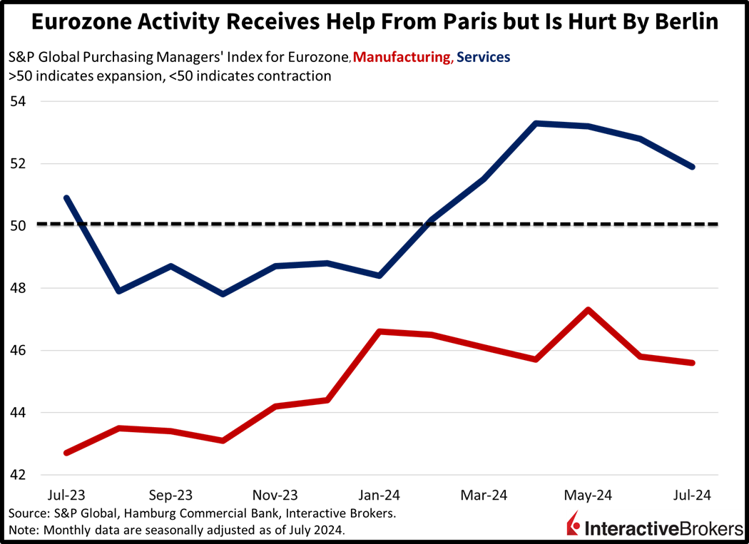 Conditions were bleak across the Atlantic in the eurozone, with business confidence and a lack of hiring weighing on overall performance. Similarly, though, the services sector expanded while the manufacturing sector contracted. Services and manufacturing PMIs came in at 51.9 and 45.6, missing the estimated 53 and 46.1. In comparison, June’s figures were 52.8 and 45.8. Also weighing on the outlook were rising inflationary pressures, contracting productivity and manufacturing orders. The French Olympics did serve to boost the services sector and offset German sluggishness, however. The combination of rising prices and deteriorating productivity may challenge the European Central Bank’s ability to dish out a rate reduction in September.