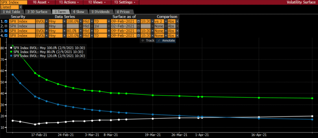 Over the past few months, we have seen speculative call prices creeping above at money options as well. Had you ever heard the term “gamma squeeze” before the past few months? As speculators gravitated to using call options to supercharge their trading strategies, options sellers have been forced to adapt. The problem is that most sellers failed to fully anticipate the enormous wave of demand for out of the money calls that arose in this current bull market. Much of the recent focus has been upon waves of buying in highly speculative individual shares, but SoftBank’s massive call buying in NASDAQ megacaps last summer was perhaps the more meaningful effect. Even though their buying was concentrated in individual shares, the sizes of both their trades and the market capitalization of affected stocks were enough to influence pricing across major indices. Just as the Crash of ’87 was sufficient to permanently affect options skew to the downside, the Gamma Squeeze of 2020-21 is likely enough to boost upside options for the foreseeable future. In other words, skew has become more symmetrical, and that is boosting VIX.