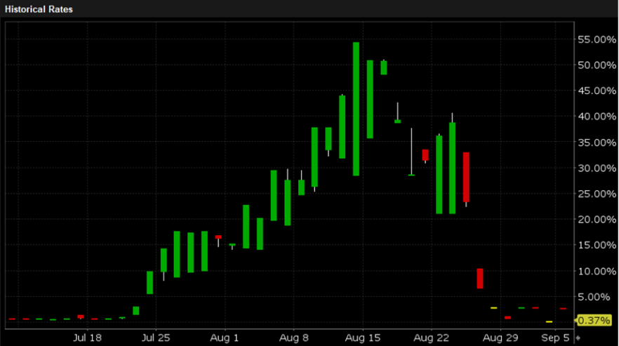 This strategy could have netted short sellers a profit should they have entered the short at $24.12 and bought back at $23.02. A 100 share short position would provide a $110 profit before commissions and fees. But borrow fees should be considered to determine the profitability of a short trade, particularly with the sharp rise in the rate. Based on the previous chart with the KVUE borrow rate from end of July to early September 2023, let’s say that the average rate was 30%. With a short position value of $2,412, a 30% fee would come out to $2.01 per day. Holding the short for 28 days would cost $56.28. The once $110 profit is now halved with the trader walking away with $53.72.