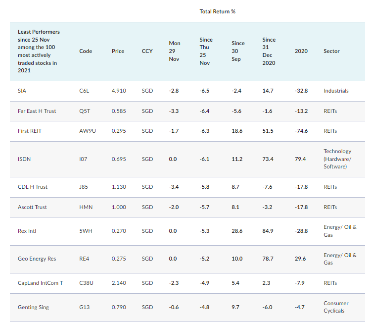 The 10 least performing stocks of the 100 most traded Singapore stocks in 2021, over the past two sessions are tabled below.