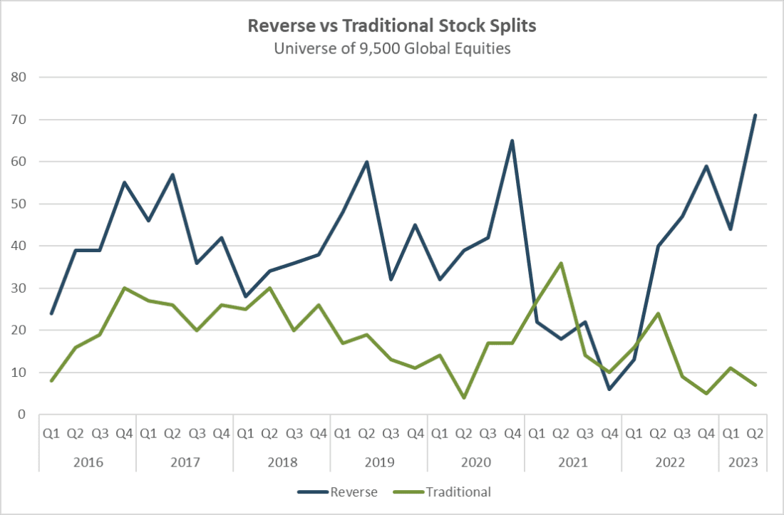 Wall Street Horizon data shows that after several quarters favoring traditional stock splits, reverse stock splits are once again more popular with publicly traded corporations. Across our coverage universe, which now spans more than 9,500 companies worldwide, reverse splits were more popular each quarter from 2016 through 2020. In the wake of the COVID-19 pandemic, as WFH and tech stocks surged, traditional splits stood in the limelight, with a greater number of those splits occurring in Q1, Q2 and Q4 2021 and Q1 2022. Since that time, reverse splits are on top once again, an interesting trend as corporations have struggled with headwinds ranging from inflation and higher interest rates to a tightening labor market and recession worries.