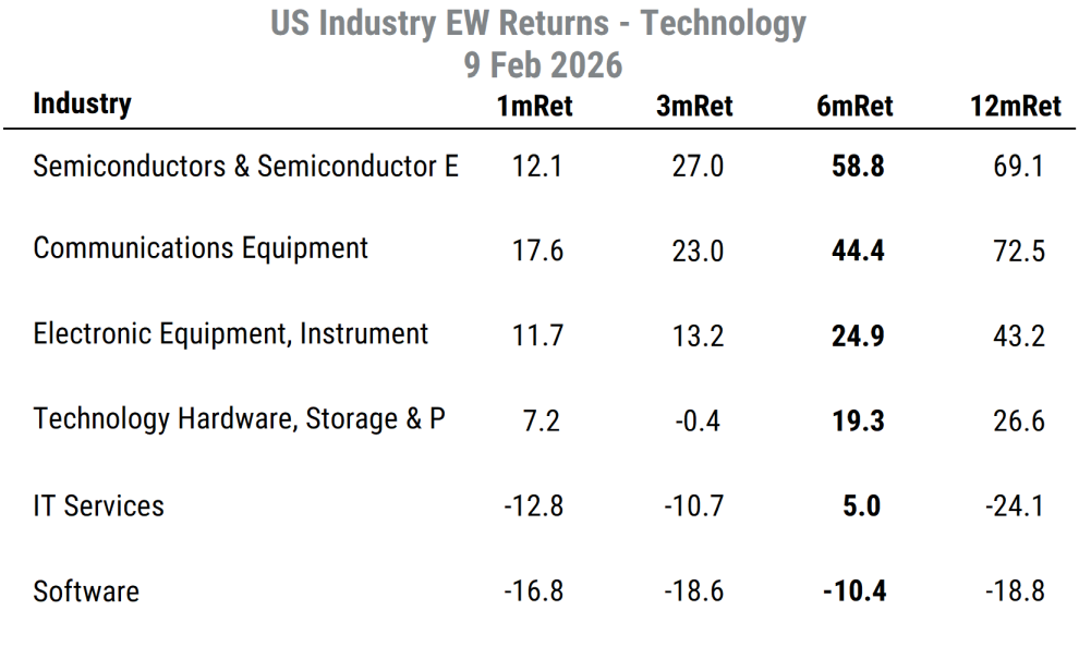 Much of the drag on Tech is focused in the near-panic selling in Software and IT Services industries, which are viewed as having business models threatened by AI. But much of the rest of the sector in the hardware-related areas has been doing ok, or in some cases, very well. Returns for Semiconductors and Communications Equipment have been quite strong, while Electronic Equipment and Tech Hardware are holding up.
