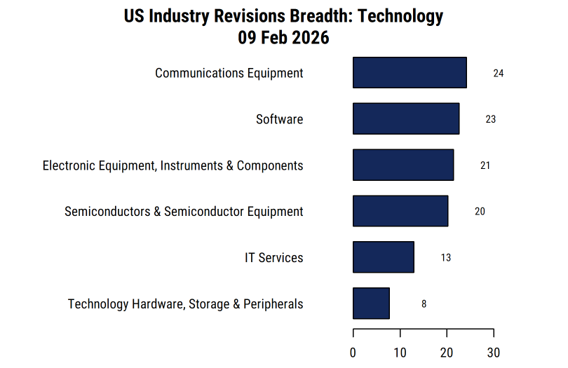 And as shown in the chart below, all six of the US Technology industries have positive equal-weighted estimate revisions breadth, with five of the six having solidly positive (20%+) readings. Revisions breadth is our measure of the proportion of analysts covering a stock that are raising versus lowering their earnings (EPS) forecasts for the next 12 months. It can range from -100% (all analysts cutting estimates) to +100% (all analysts raising estimates). We can then aggregate the breadth readings for each stock in an industry to see how the industry is doing overall.