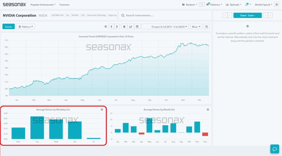 You too can display the days of the week for all instruments in Seasonax. All you have to do is call up a value. The weekday history appears immediately below the seasonal chart.