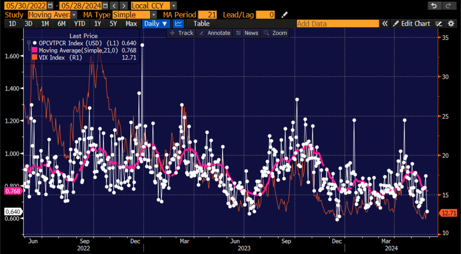 US Composite Put/Call Ratio (white) with 21-Day Moving Average (magenta) and VIX (red)