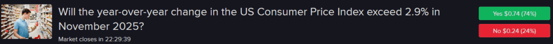 Contracts associated with tomorrow’s US Consumer Price Index (CPI) offer odds of a headline number north of 2.9% with a 74% degree of confidence while a statistic lower than 3.2%, or failing to exceed 3.1%, is at 94%. For core, meanwhile, the gauge that excludes food and energy, there’s a 53% chance of a result that arrives above 2.9% and a 45% likelihood of a figure that comes in at 2.9% or under.