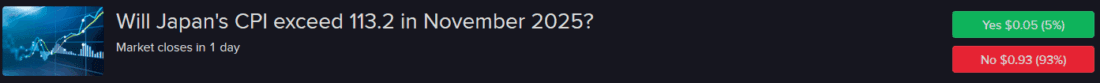Japan’s CPI is expected to have increased 3% year over year last month to 113.3, which compare to 112.8 in October and 110 in November of last year. Meanwhile, the “Yes” contracts at 112.4 and 113.2 are undervalued at $0.72 and $0.05 in my opinion and should be closer to $0.90 and $0.55.