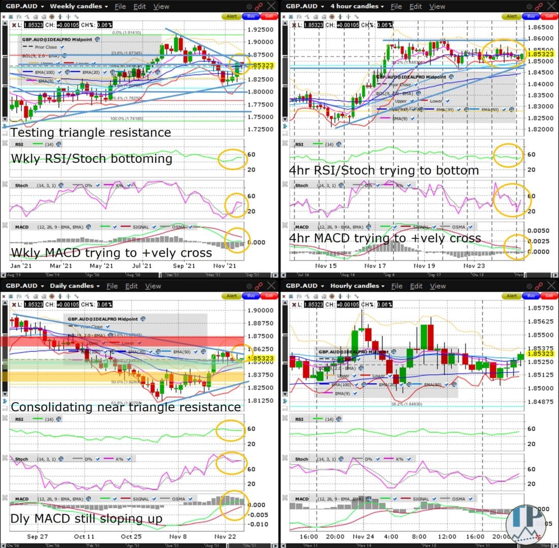 The GBPAUD is consolidating for a 6th straight day going into today’s European morning, hovering just below ascending triangle resistance (on the 4hr chart).  Significantly, GBPAUD has been testing triangle resistance (on the daily and weekly chart), with odds high for a test of the 50% Fib retrace of the August to November slide by month end.  Any reclaiming of the 2021 high will likely have to wait until Q1 sometime.  For the balance of this week, the trading range will be relatively tight given today’s US Thanksgiving holiday.  Congratulations to readers alerted to the near complete major bottoming Jun 14th and who benefited.  The weekly, daily and 4hr RSI, Stochastics and MACD are bottomish, rallying or consolidating recent gains.  I am looking to enter long in the green zone (of the daily chart), targeting the red zone for Wednesday.  The amber/yellow zone is where I might place a stop if I was a swing trader (although in my personal account with which I seldom hold overnight I sometimes set my stops tighter).