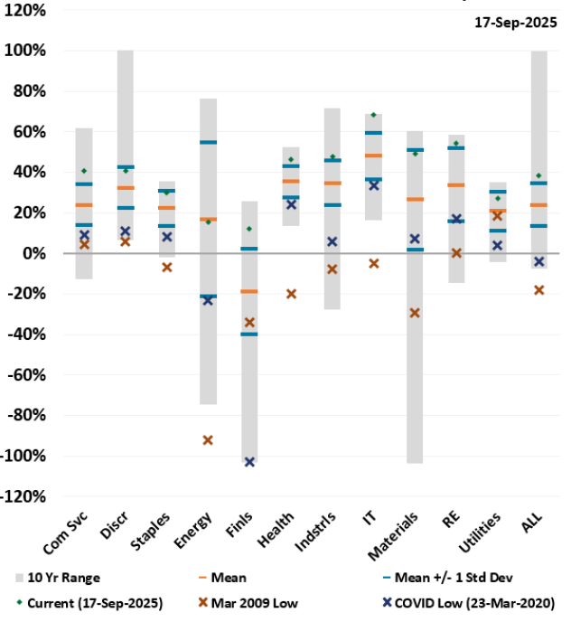 The global IT sector has reached the top end of the 10-year range in Future Growth Reliance, our P/E equivalent. FGR for all but the Energy sector is around 1 standard deviation above the mean. EVA Momentum needs to continue to improve from here to form any justification for having such elevated expectations. See our “Following the EVA Momentum” paper this week to identify firms that have been driving the improvement. It is not just NVDA or the Mag 7. The Future Growth Reliance (FGR) indicates the percentage of the market cap coming from investors’ expectations for future wealth creation (Future Value Added or FVA), above and beyond the current level of value creation.
