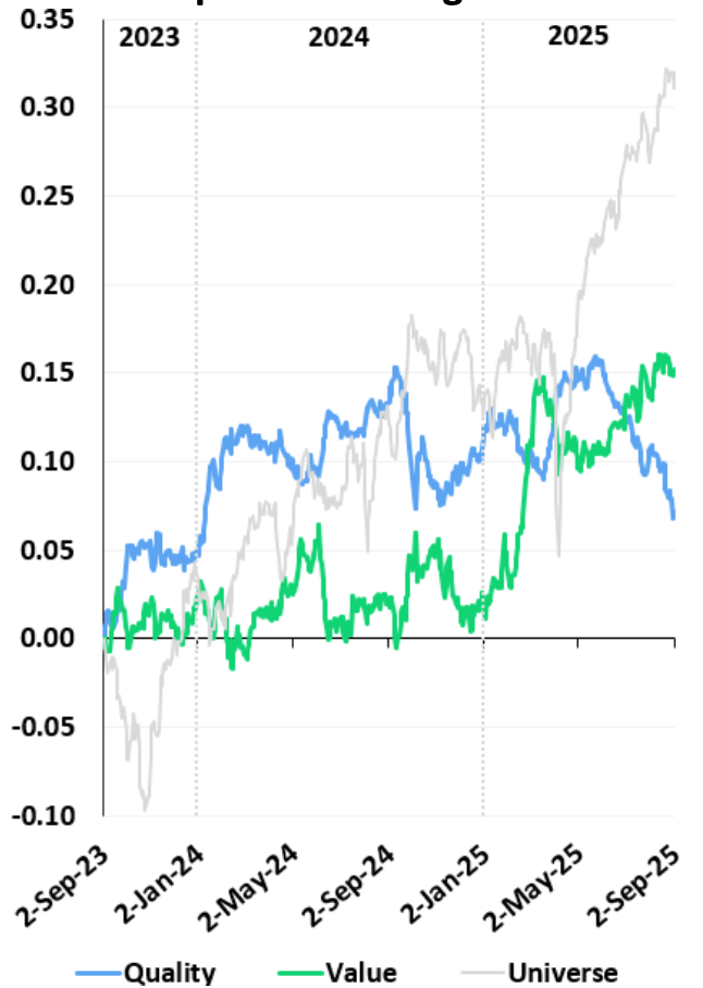 Global aggregate EVA Momentum (growth) hovered close to zero growth in Q3, after having seen 21 months of improvement to incremental EVA growth. Consensus has edged down in the outlook for Q4 and the 1H of 2026, suggesting EVA Momentum turns further negative before recovering in the 2H of 2026. With such elevated current market expectations for the ongoing recovery in value creation, investors should be mindful of the implied rolling over of growth.