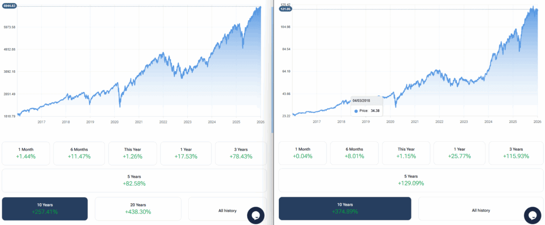This article is severely, fundamentally flawed. It fails to account for dividends. If you had bought 100 shares of the S&P 500 ETF (aka “the SPY”) in January 2006 when it was $128 it would have cost you $12800. It closed Friday at $694.07. But the dividends you would have collected the past 20 years total $8512, so your actual cost basis would be lowered from $12800 to $4288. Your 100 shares of the SPY would now be worth $69400, so that is a gain of over 1500 Percent (!!!)