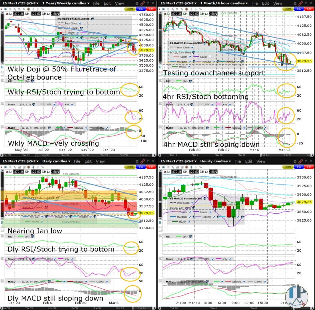 The S&P500 (ES) is trying to form a weekly Doji after rebounding off near the 2023 low and the 61.8% Fib retrace of the October to February bounce.  Although odds are now moderate for this week’s short covering to spring ES back to the psychologically key 4k whole figure level, ES is less likely to retest the weekly chart downchannel resistance before month end than it is to slide below the November low in the same period.  The slightly higher February high versus the January and December highs appears to have been a bear trap.  Watch for volatility today 830am EST following the US CPI, Wednesday with the US core PPI, retail sales, Empire State Manufacturing index and PPI, and after Friday’s US preliminary UoM consumer sentiment.  The escalation in the Ukraine-Russia conflict deserves close monitoring.  Congratulations to paying subscribers who benefited from the Oct 18, 2022 analysis highlighting the early stages of a month plus Dead Cat Bounce, or from the February 18, 2020 analysis one day before the record high in the ES, warning of the pending slide in the S&P500.  The somewhat bottomish weekly RSI and Stochastics are being weighed on by the negatively crossing weekly MACD.  I am looking to enter short in the red zone (of the daily chart), targeting the green zone for Monday.  The amber/yellow zone is where I might place a stop if I was a swing trader (although in my personal account with which I seldom hold overnight I sometimes set my stops tighter).  Click here for analysis on VIX, GBPUSD