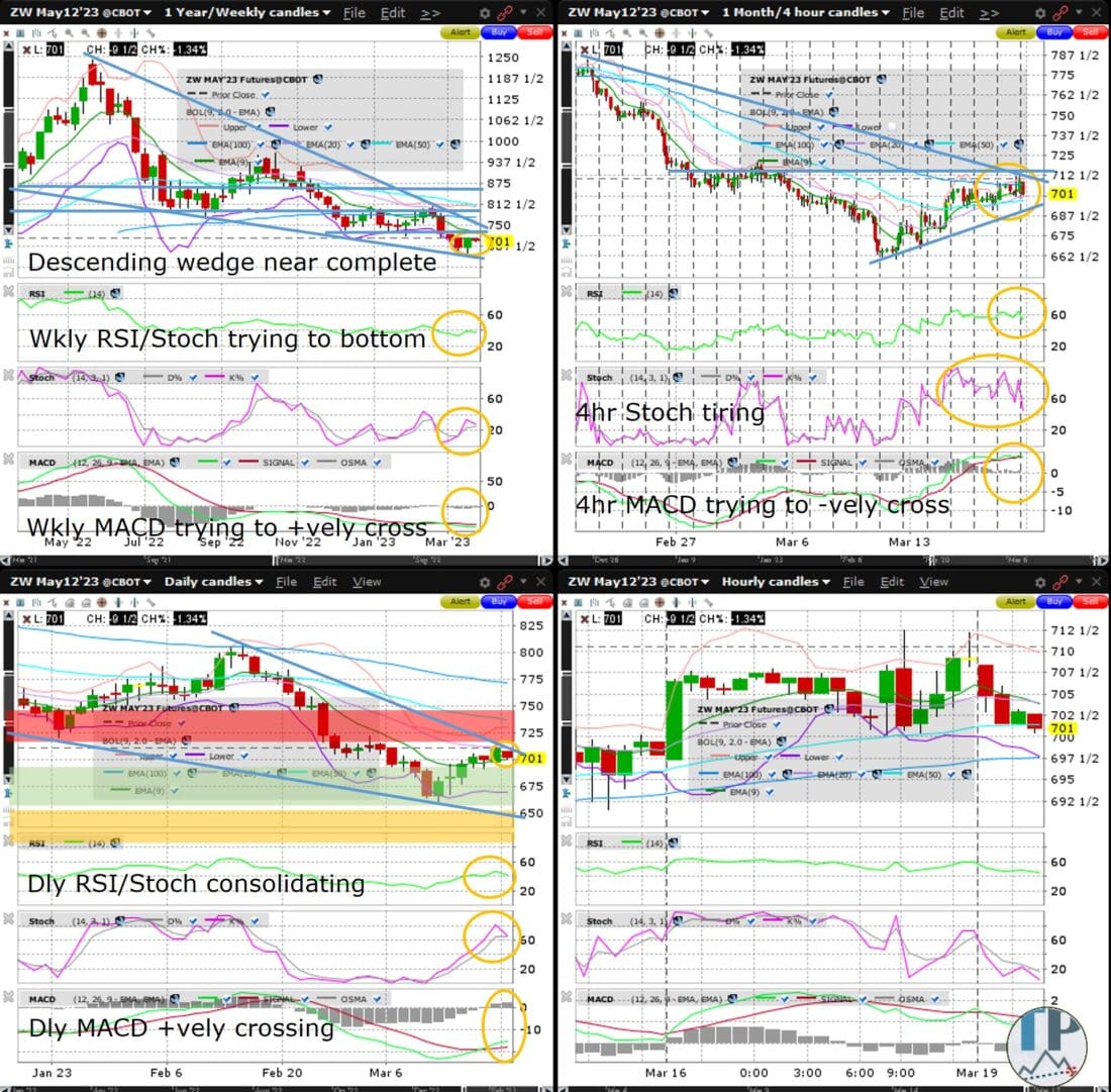Wheat (ZW) is consolidating near the psychologically key 700 whole figure level after bouncing off the 2023 low (formed a bit more than a week ago).  Odds are moderate for a break of descending wedge resistance (on the weekly chart) before month end, which if successful, would neutralize the bear trend since the May high and dramatically increase the likelihood of ZW retesting the February high in the week after.  The escalation in the Ukraine-Russia conflict deserves close monitoring.  Congratulations to Premium Members alerted Feb 14, 2022 to the looming resumption in the major uptrend and who benefited, along with those who took advantage of  the Aug 21, 2020 highlighting of ZW’s major bottoming effort.  The weekly and daily RSI, Stochastics and MACD are bottomish, rallying or consolidating recent gains.  I am looking to go long in the green zone (of the daily chart), targeting the red zone for Friday.  The amber/yellow zone is where I might place a stop if I was a swing trader (although in my personal account with which I seldom hold overnight I sometimes set my stops tighter).  Click here for analysis on SOYBEAN, GBPAUD