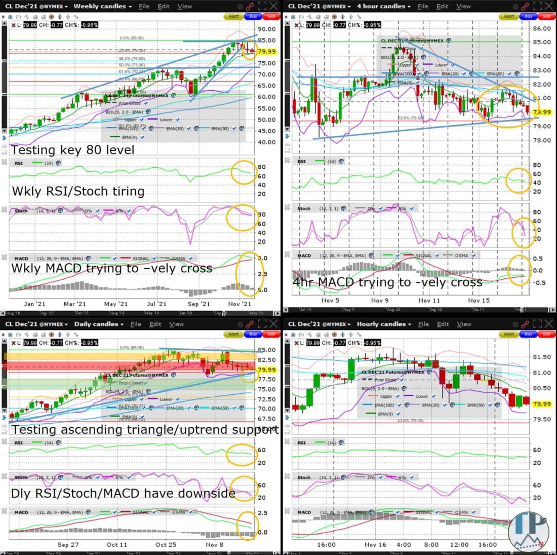WTI Crude (CL) is edging lower to start the week, looking vulnerable to decisively breaking the psychologically key 80 whole figure level in the day or so following today’s highly anticipated weekly inventory data.  Significantly, CL’s weekly Gravestone last week was rejected at the recent fresh 2021 high, leaving CL unable to reclaim prior ascending wedge support (on the weekly chart).  Any daily close below the daily chart uptrend support will dramatically increase the likelihood of a long red bodied weekly candle this week.  Congratulations to readers who heeded the August 4th warning of CL’s vulnerability, and to Premium Members who benefited from the bullish triangle breakout highlighted Nov 18th.  The weekly, daily and 4hr RSI, Stochastics and MACD are tiring or steadily sloping down.  I am looking at entering short in the red zone (of the daily chart), targeting the green zone for Tuesday.  The amber/yellow zone is where I might place a stop if I was a swing trader (although in my personal account with which I seldom hold overnight I sometimes set my stops tighter).