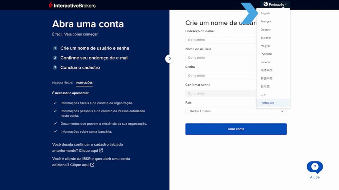 Em nosso site, é possível encontrar determinados requisitos gerais para solicitantes individuais e institucionais, incluindo informações de contato e detalhes da conta bancária, além dos requisitos específicos para o tipo de conta solicitada. Você pode até selecionar um idioma diferente para se cadastrar, se necessário. Suporte adicional também está disponível em nossos serviços de Ajuda.