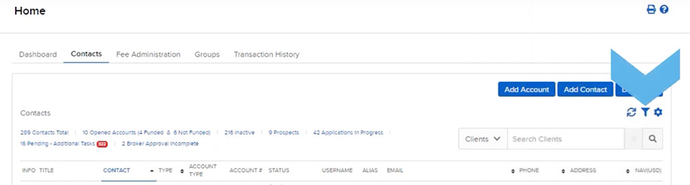 The broker can also use the Filter icon towards the upper right of the page to further filter by Contact Type, Account Type, or Account Status.
