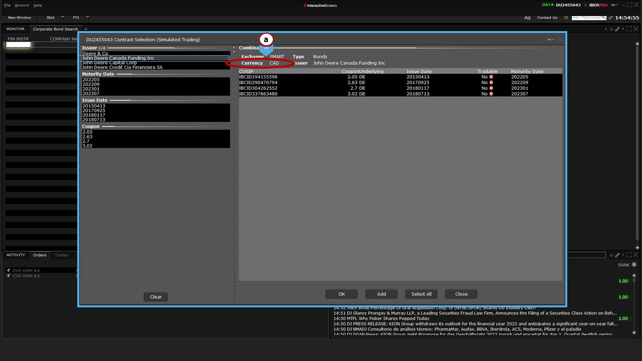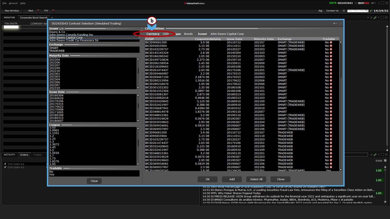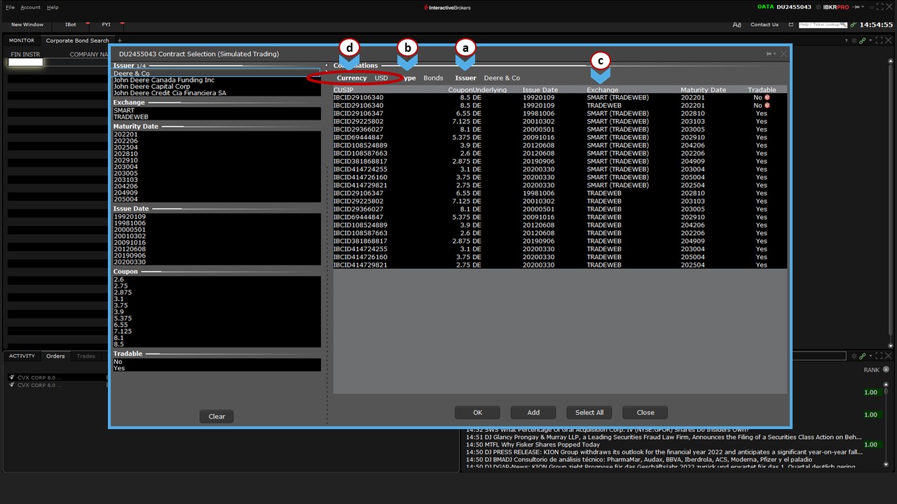 The correct selection is (f) listed under Corporate Fixed Income. Click (2) that selection to display (g) the Contract Selection tool. If you widen the Issuer column, you’ll see all the subsidiaries whose debt is listed in TWS.