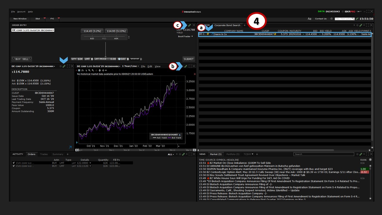 The Monitor (a) now reflects the bond that has been added, and when (4) clicked, that specific security will display in (b) charts, (c) order entry, or any other color-linked panel.