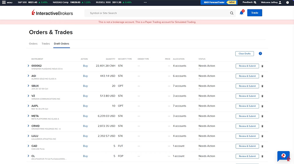 The Advisor will automatically be brought to the Draft Orders tab of the Orders & Trades page. The Advisor can transmit the orders by selecting Review & Submit, delete an order using the trash icon, or clear drafts. The orders can also be accessed through the Orders & Trades tab to submit at a later time.