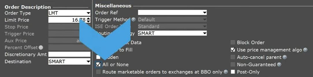 You may want to use an All-or-None order if you are not time sensitive on the fill but want to have either your entire ordered filled or nothing filled, hence the name All-or-None.