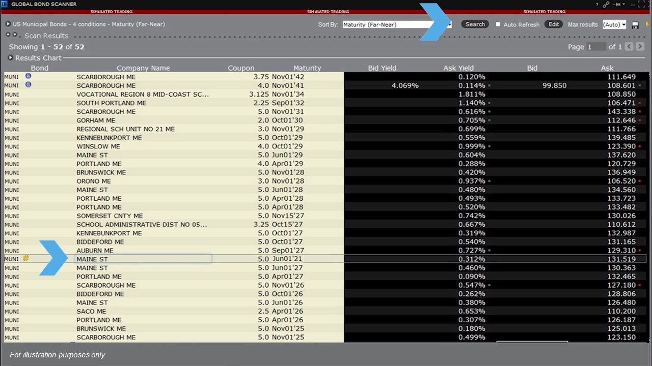 In the results that follow, you can see we have narrowed the selection to only those State of Maine GOs that have a minimum ‘A1’ credit rating as assigned by Moody’s.