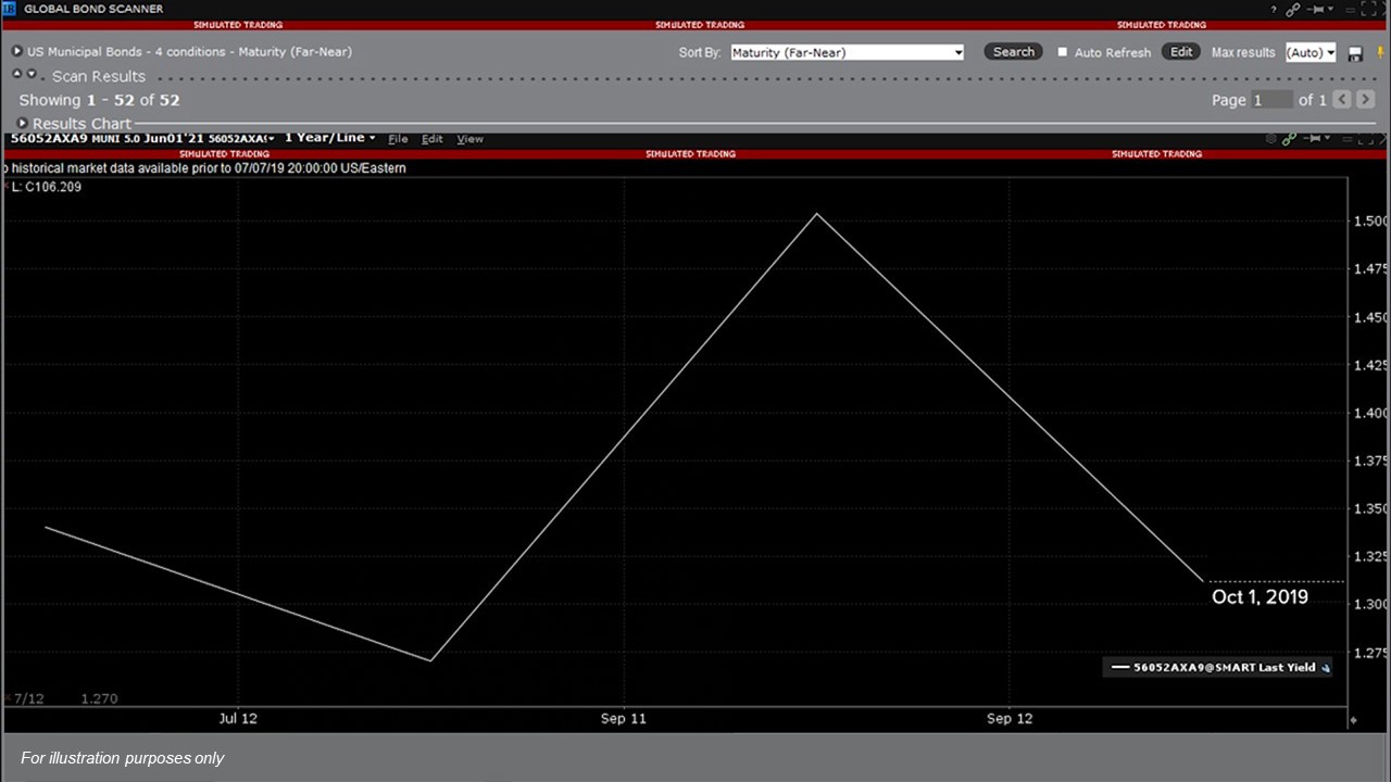 In the Global Bond Scanner, under Instrument on the top left, select US Municipal Bonds. You will also see a host of filters to help you narrow your search, including by maturity, credit rating, whether the bond is a GO, a revenue bond, whether it is subject to the Alternative Minimum Tax (AMT), along with several other fields.