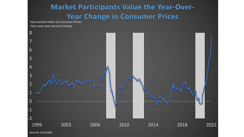 Market participants value the year-over-year change in consumer prices. Consumer prices rising at an accelerated pace could make things less affordable and turn into longer-term inflationary issues. To control inflation, keep inflation expectations “anchored” at a desired level and restore economic balance, the European Central Bank or ECB will likely tighten monetary policy. Consumer prices decelerating or outright falling, deflation, could be dangerous signals of weakness in the economy, weak population growth and/or recession. If demand declines on a long-term basis, wages may drop, unemployment may rise, and investment portfolios will be negatively affected. Since experiencing the negative consequences of deflation during the Great Depression of the 1930s, central banks have been cautious of deflationary developments and have favored prices rising in a gentle and predictable way to support economic and population growth, the ECB’s target for inflation is two percent.