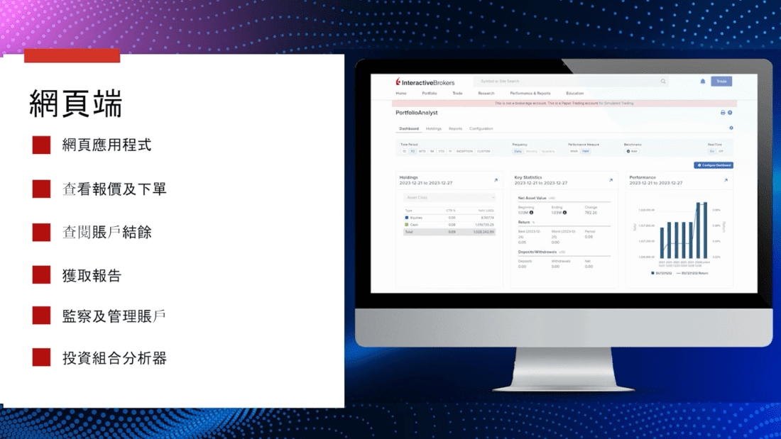此外,網頁端 是一款使用方便的網頁應用,客戶可在此查看報價和下單、檢查賬戶結餘、取得報告,並連接您用來監察及管理賬戶的所有工具和功能 — 包括投資組合分析器 — 這是一款廣博的分析工具,幫助您整合、追蹤和分析投資組合。