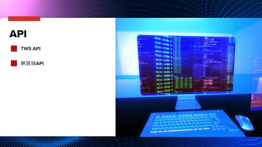 對於想運用應用程式編程接口(API)建立交易解決方案的用戶,IBKR提供了TWS API — 這是一款簡單而強大的介面,可供您自動化交易策略、實時監察賬戶餘額和投資組合;網頁端API則提供簡單的整合、FYI消息和多種其它功能,可供客戶交易、監察和管理自己的賬戶。